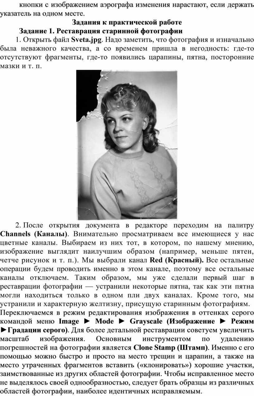 1. Открыть файл Sveta.jpg. Надо заметить, что фотография и изначально была неважного качества, а со временем пришла в негодность: где-то отсутствуют фрагменты, где-то появились царапины, пятна, посторонние мазки и т. п.