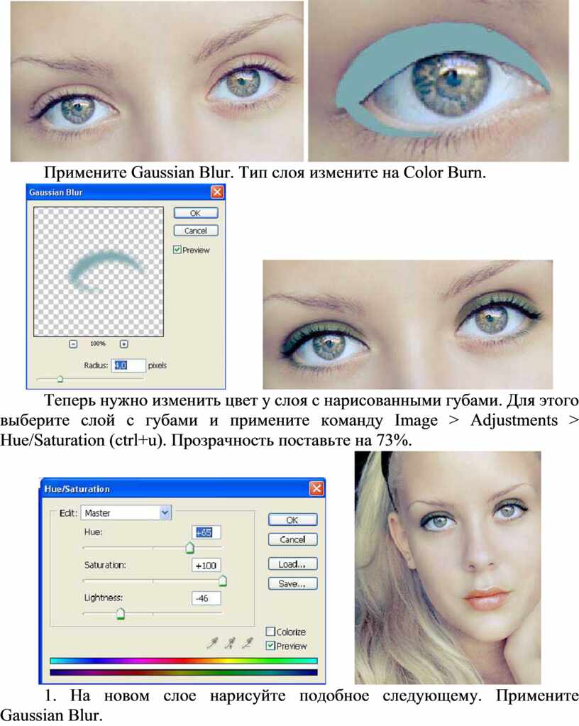 Теперь нужно изменить цвет у слоя с нарисованными губами. Для этого выберите слой с губами и примените команду Image > Adjustments > Hue/Saturation (ctrl+u). Прозрачность поставьте на 73%.