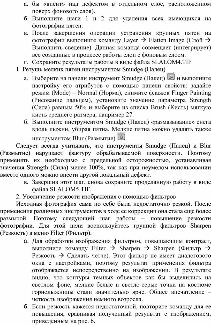 г. После завершения операции устранения крупных пятен на фотографии выполните команду Layer à Flatten Image (Слой à Выполнить сведение). Данная команда совмещает (интегрирует) все созданные в процессе работы слои с фоновым слоем.