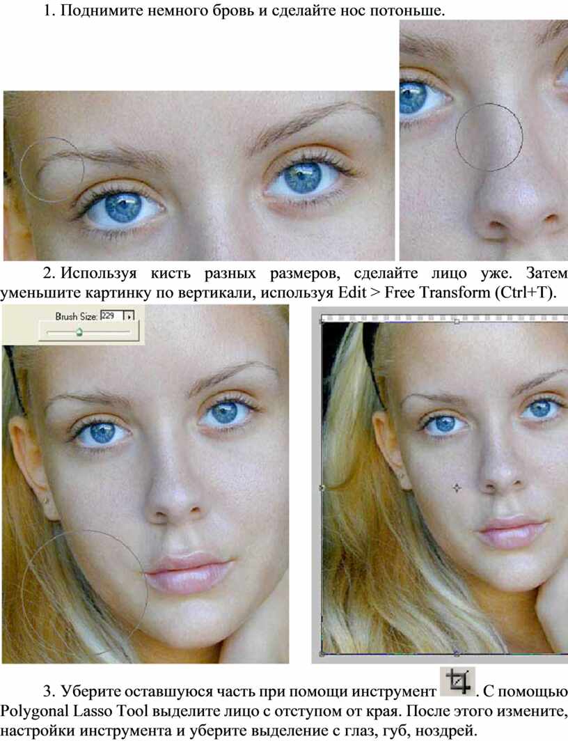6. Используя кисть разных размеров, сделайте лицо уже. Затем уменьшите картинку по вертикали, используя Edit > Free Transform (Ctrl+T).