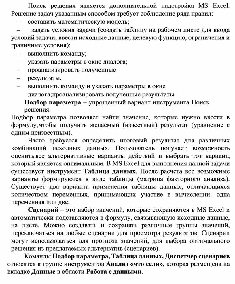 Команды Подбор параметра, Таблица данных, Диспетчер сценариев относятся к группе инструментов Анализ «что если», которая размещена на вкладке Данные в области Работа с данными.