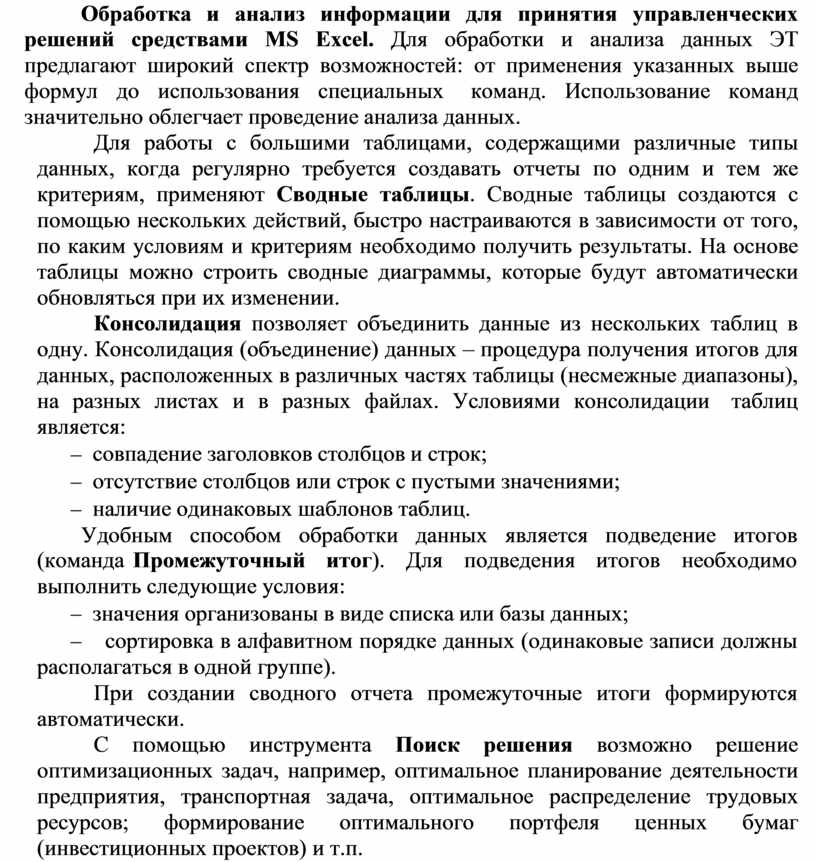 Обработка и анализ информации для принятия управленческих решений средствами MS Excel. Для обработки и анализа данных ЭТ предлагают широкий спектр возможностей: от применения указанных выше формул до использования специальных команд. Использование команд значительно облегчает проведение анализа данных.