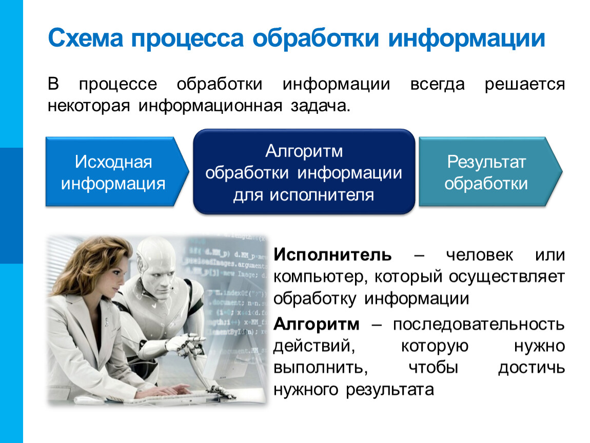 Исполнитель – человек или компьютер, который осуществляет обработку информации