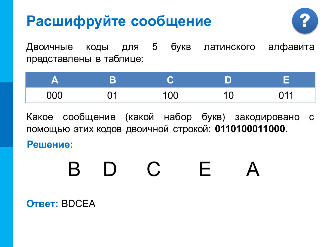 Какое сообщение (какой набор букв) закодировано с помощью этих кодов двоичной строкой: 0110100011000.