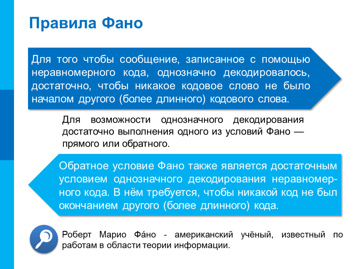 Для возможности однозначного декодирования достаточно выполнения одного из условий Фано —прямого или обратного.