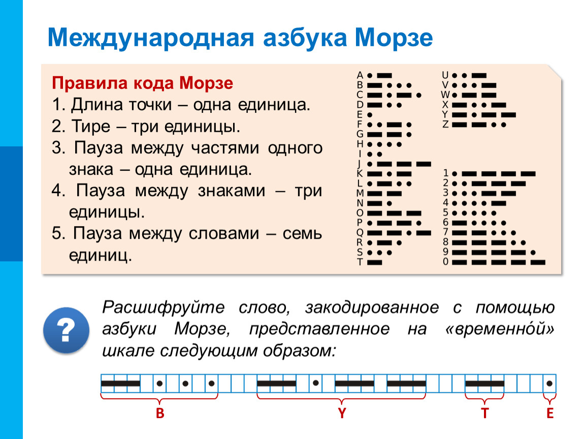 Азбука Морзе, названная так в честь американского изобретате-ля и художника Сэмюэля Морзе, – самый известный пример нерав-номерного кода, в котором цифры и буквы алфавита представляют-ся последовательностями длин-ных («тире») и коротких («точек») сигналов.