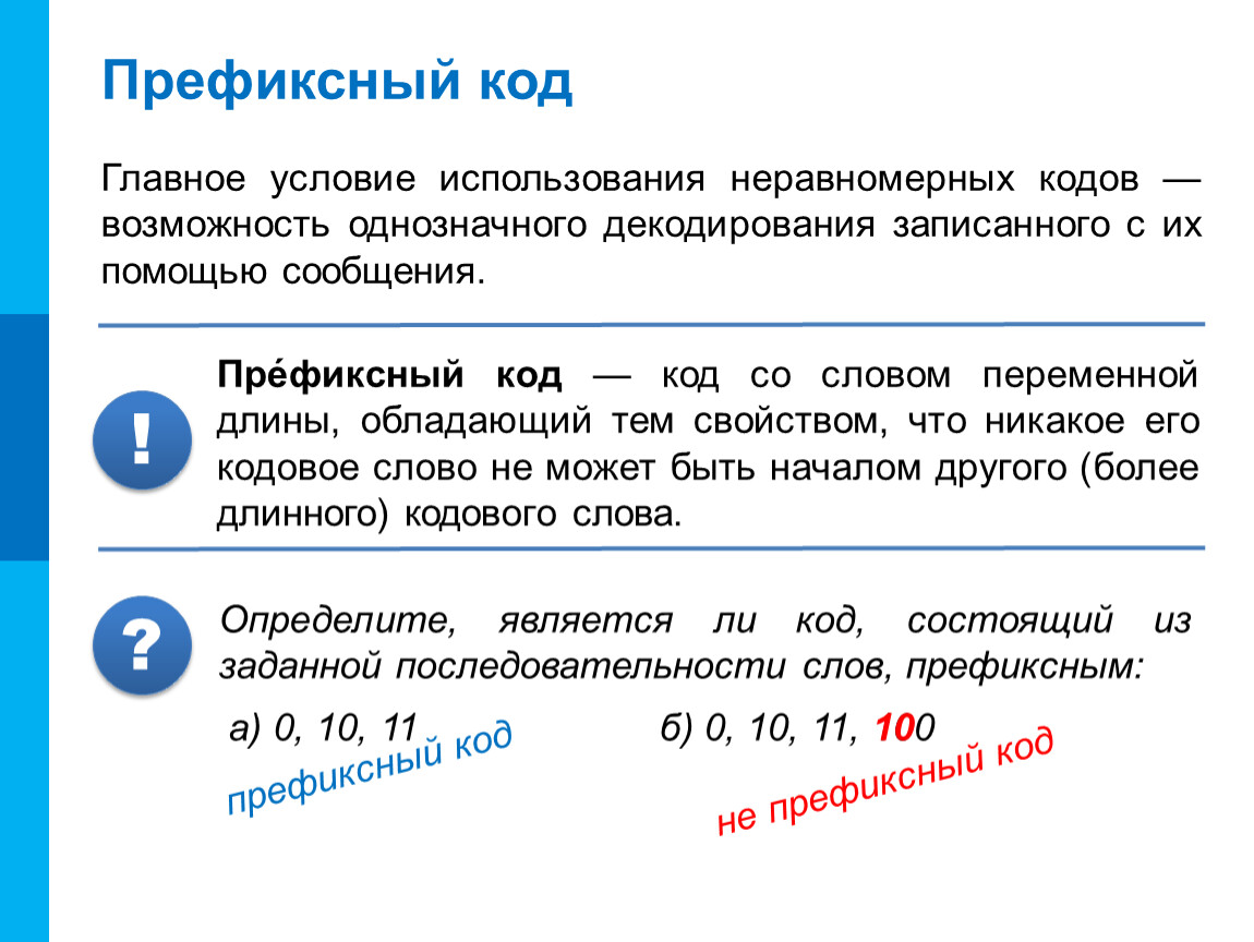 Для того чтобы сообщение, записанное с помощью неравномерного кода, однозначно декодировалось, достаточно, чтобы никакое кодовое слово не было началом другого (более длинного) кодового слова.