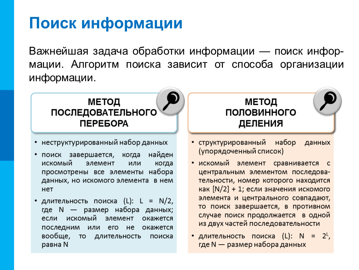 Важнейшая задача обработки информации — поиск инфор-мации. Алгоритм поиска зависит от способа организации информации.