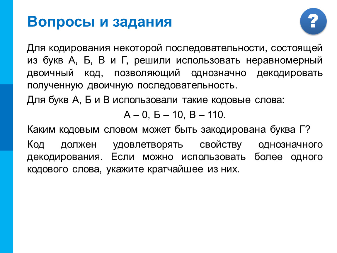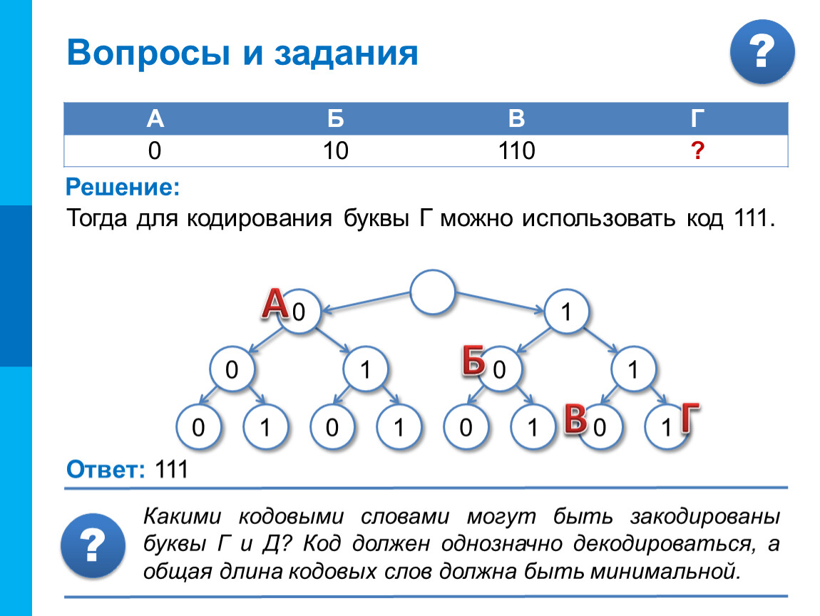 Для кодирования некоторой последовательности, состоящей из букв А, Б, В и Г, решили использовать неравномерный двоичный код, позволяющий однозначно декодировать полученную двоичную последовательность.