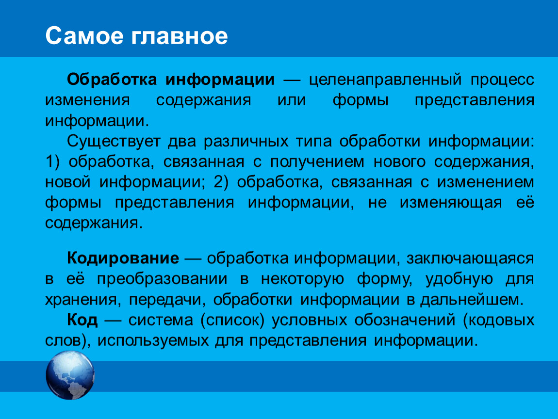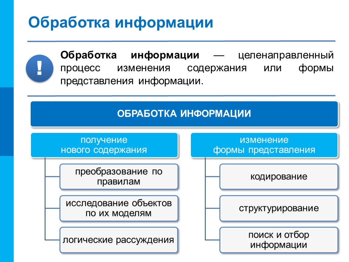 Обработка информации — целенаправленный процесс изменения содержания или формы представления информации.