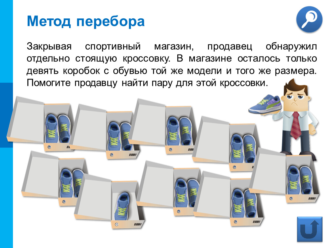 Закрывая спортивный магазин, продавец обнаружил отдельно стоящую кроссовку. В магазине осталось только девять коробок с обувью той же модели и того же размера. Помогите продавцу найти пару для этой кроссовки.