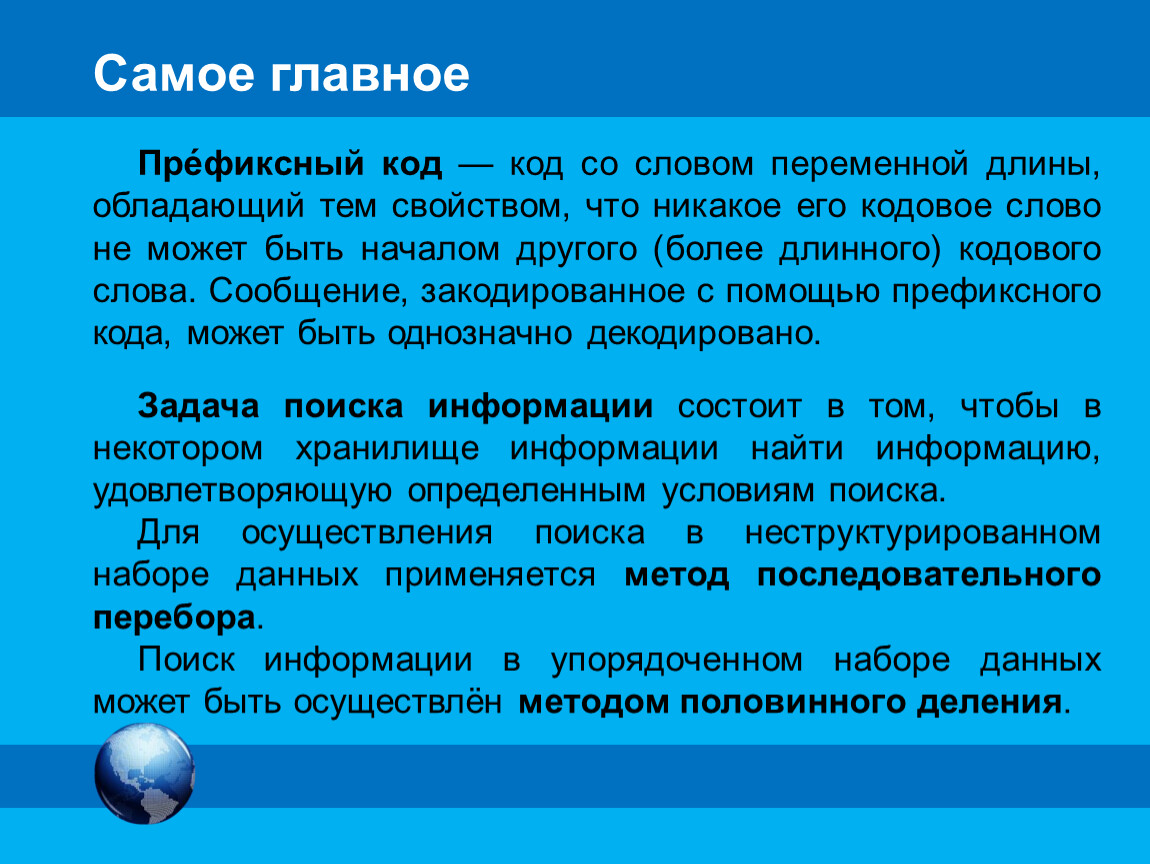 Поиск информации в упорядоченном наборе данных может быть осуществлён методом половинного деления.