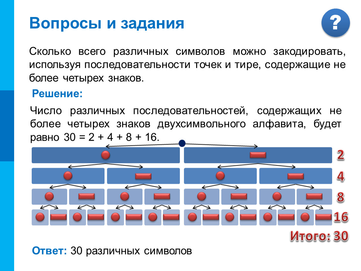 Число различных последовательностей, содержащих не более четырех знаков двухсимвольного алфавита, будет равно 30 = 2 + 4 + 8 + 16.
