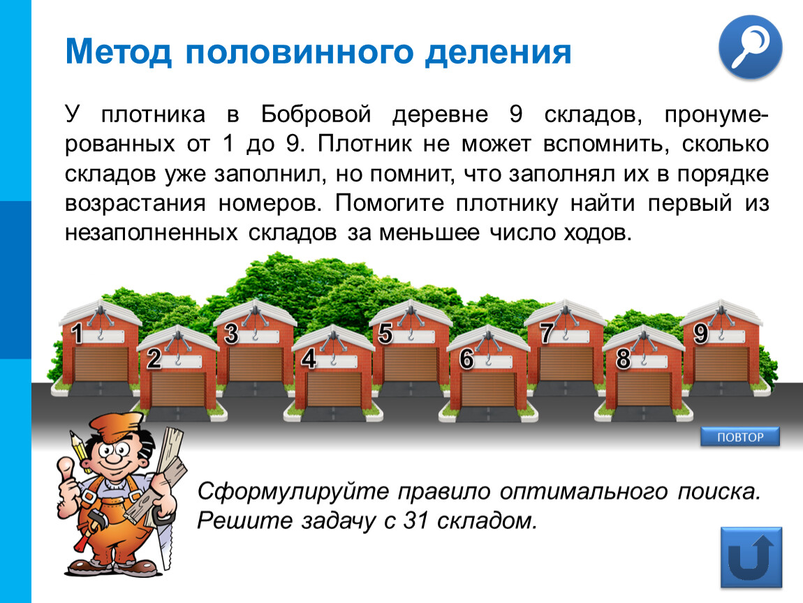 У плотника в Бобровой деревне 9 складов, пронуме-рованных от 1 до 9. Плотник не может вспомнить, сколько складов уже заполнил, но помнит, что заполнял их в порядке возрастания номеров. Помогите плотнику найти первый из незаполненных складов за меньшее число ходов.