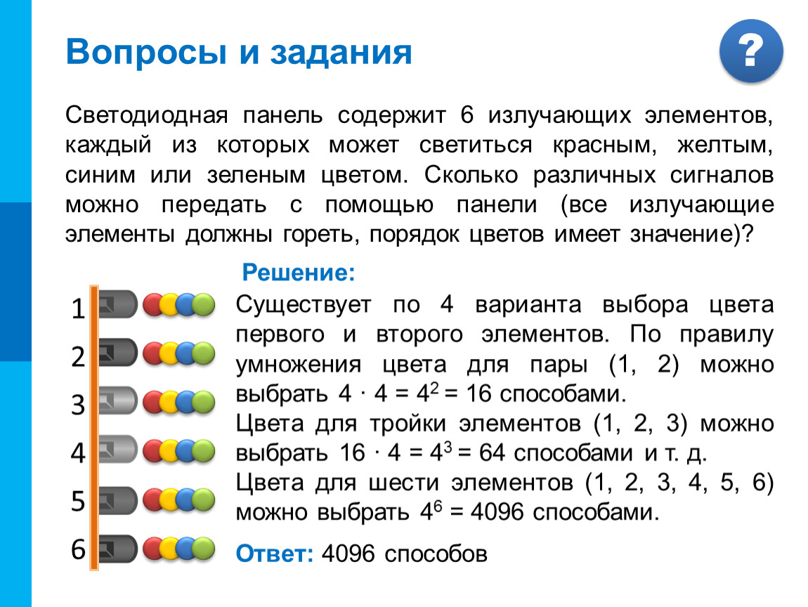Существует по 4 варианта выбора цвета первого и второго элементов. По правилу умножения цвета для пары (1, 2) можно выбрать 4 · 4 = 42 = 16 способами.