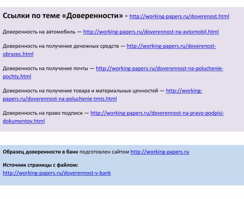 Ссылки по теме «Доверенности» - http://working-papers.ru/doverenost.html Доверенность на автомобиль — http://working-papers.ru/doverennost-na-avtomobil.html Доверенность на получение денежных средств — http://working-papers.ru/doverenost-obrazec.html Доверенность на получение почты — http://working-papers.ru/doverennost-na-poluchenie-pochty.html Доверенность на получение товара и материальных ценностей — http://working-papers.ru/doverennost-na-poluchenie-tmts.html Доверенность на право подписи — http://working-papers.ru/doverennost-na-pravo-podpisi-dokumentov.html |