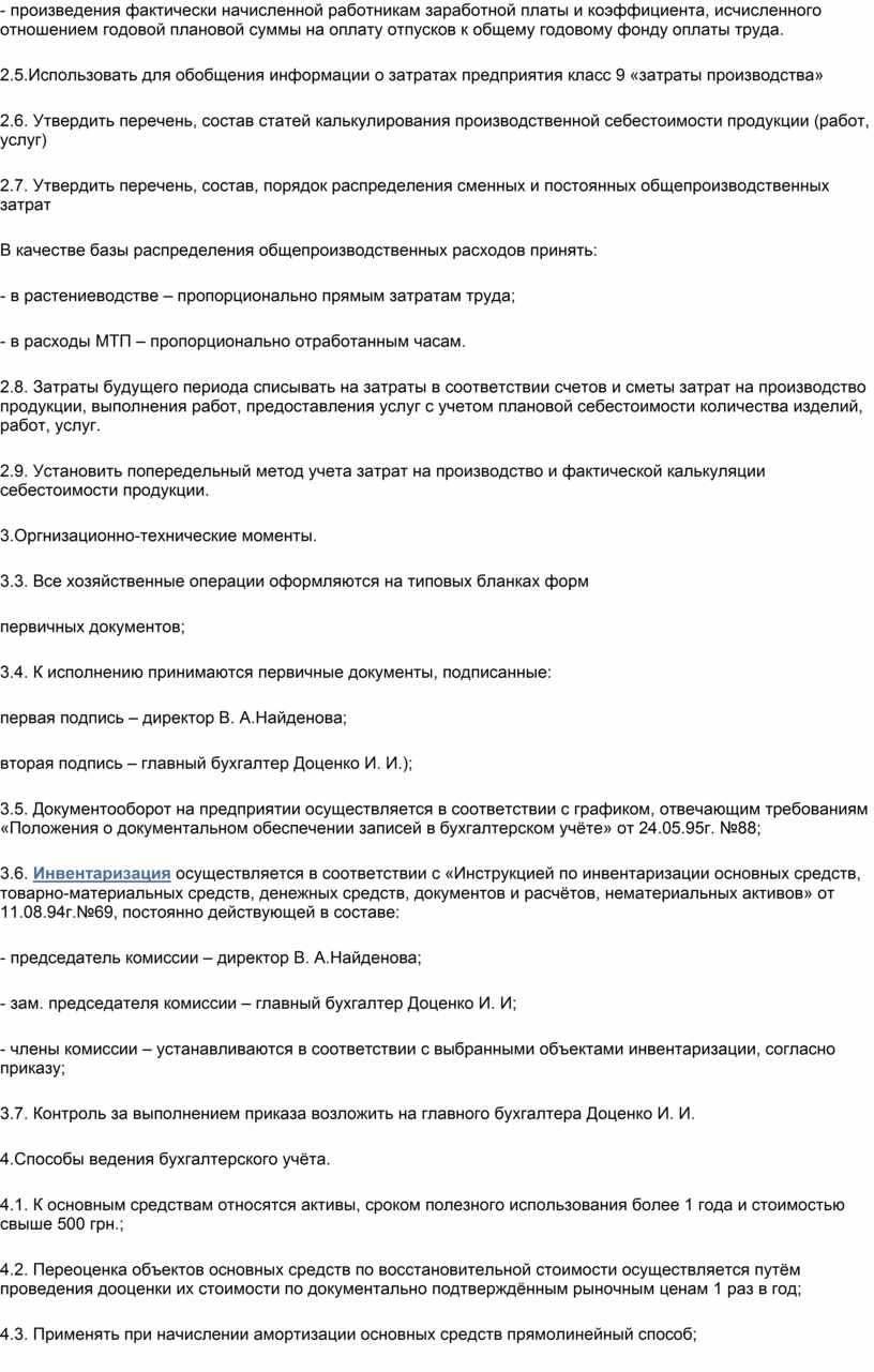 3.6. Инвентаризация осуществляется в соответствии с «Инструкцией по инвентаризации основных средств, товарно-материальных средств, денежных средств, документов и расчётов, нематериальных активов» от 11.08.94г.№69, постоянно действующей в составе: