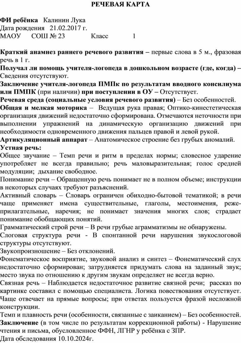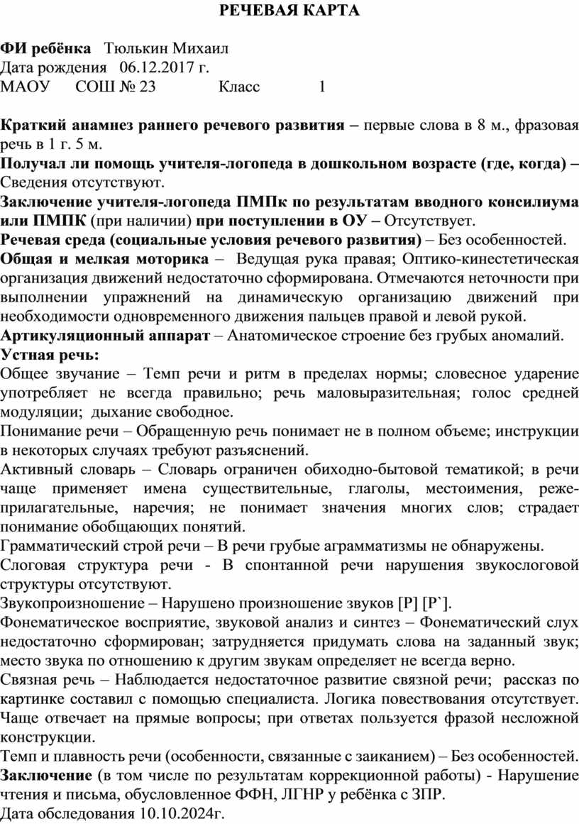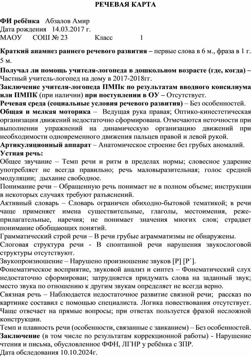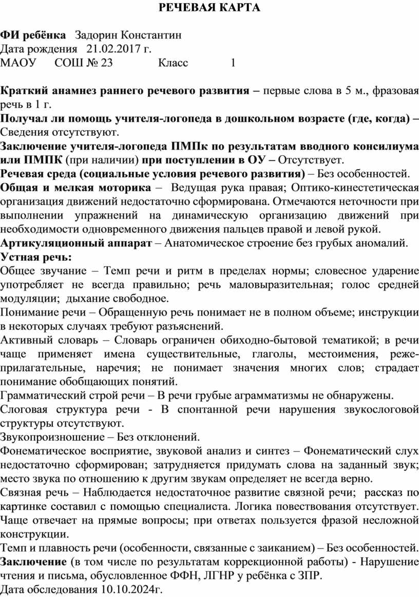 Заключение (в том числе по результатам коррекционной работы) - Нарушение чтения и письма, обусловленное ФФН, ЛГНР у ребёнка с ЗПР.