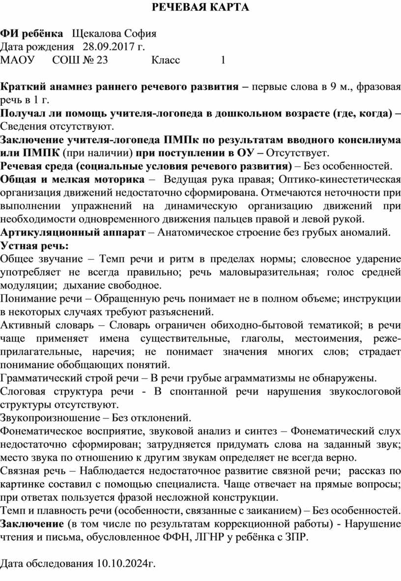 Краткий анамнез раннего речевого развития – первые слова в 9 м., фразовая речь в 1 г.