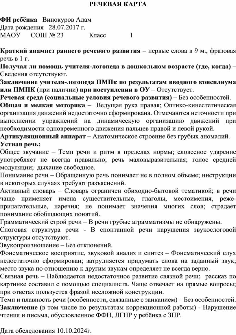 Заключение учителя-логопеда ПМПк по результатам вводного консилиума или ПМПК (при наличии) при поступлении в ОУ – Отсутствует.