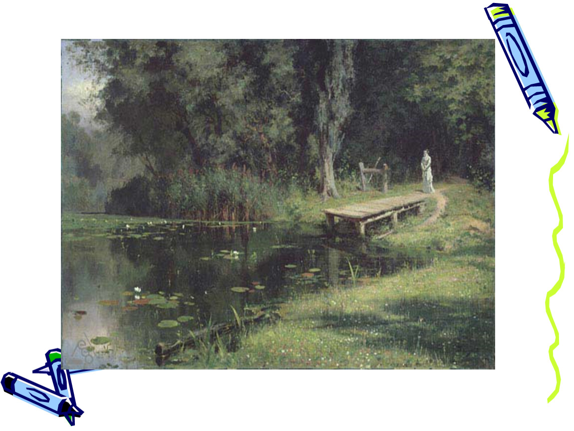 Пруд, слабо освещающийся лучами заходящего солнца;