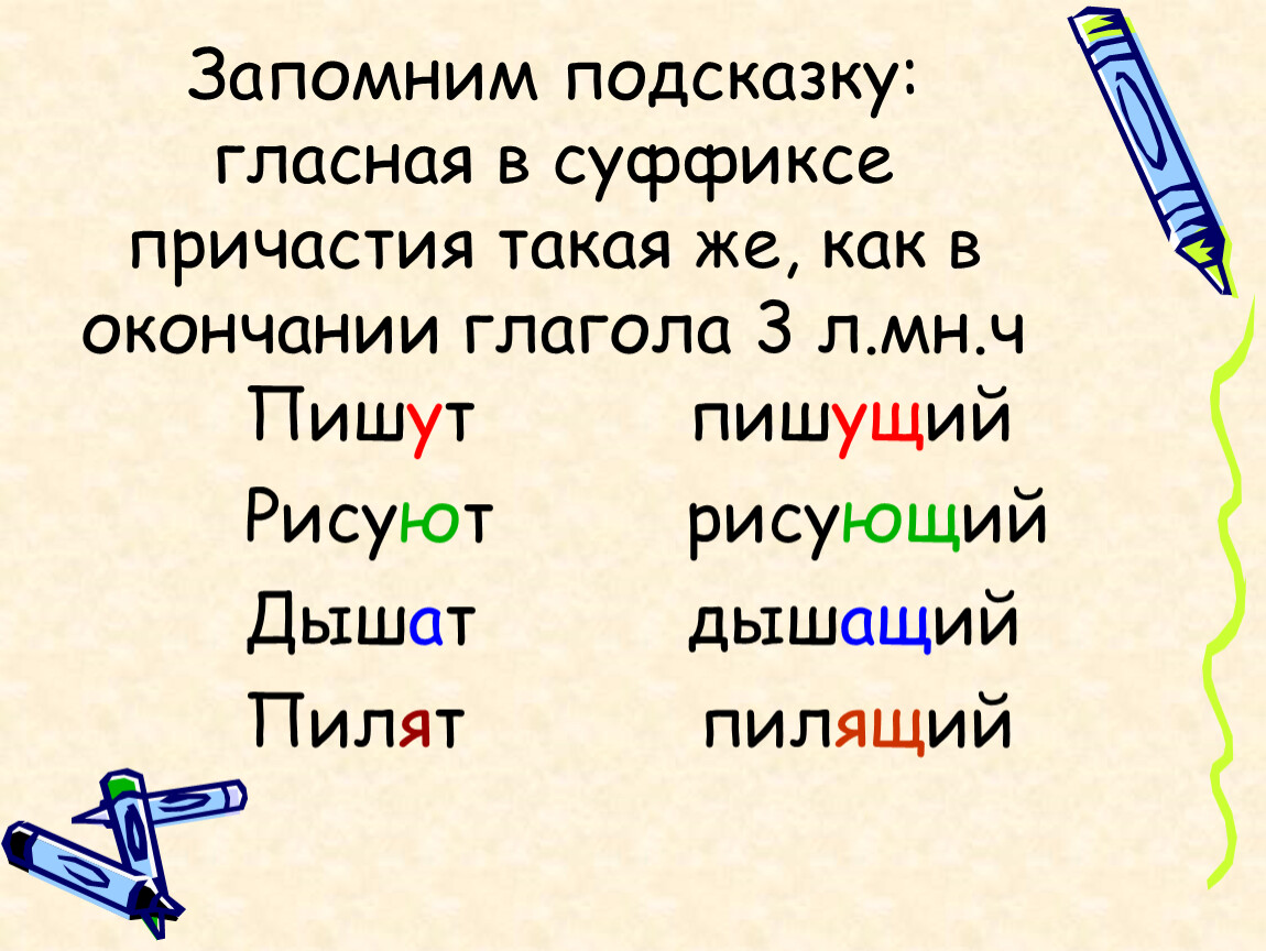 Запомним подсказку: гласная в суффиксе причастия такая же, как в окончании глагола 3 л.мн.ч