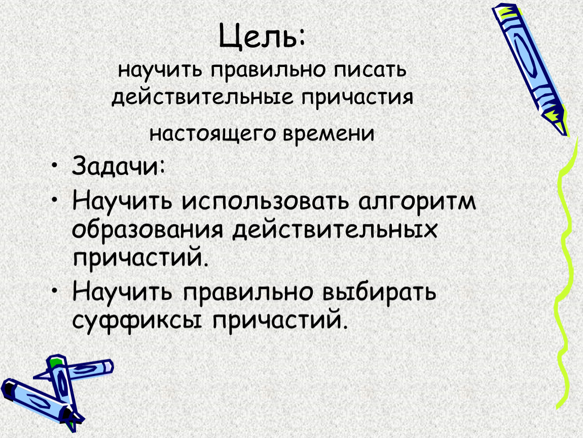 Цель:научить правильно писать действительные причастия настоящего времени