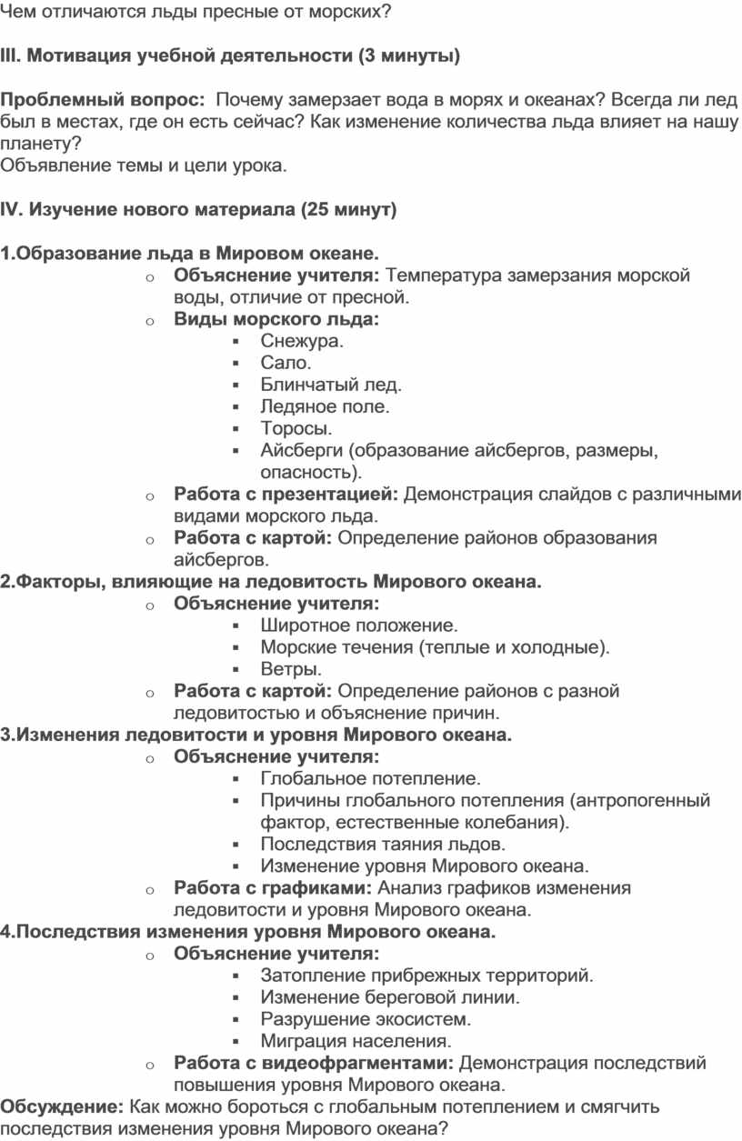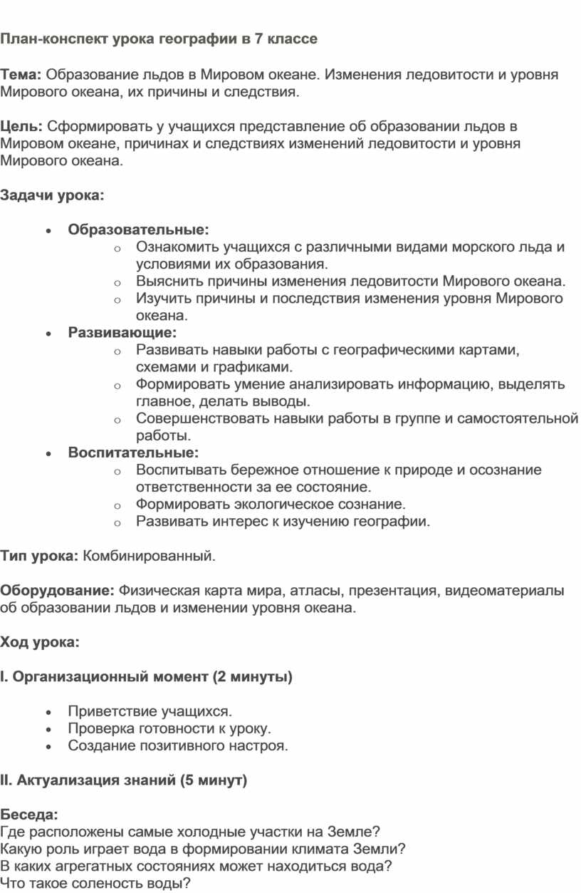 Цель: Сформировать у учащихся представление об образовании льдов в Мировом океане, причинах и следствиях изменений ледовитости и уровня Мирового океана.