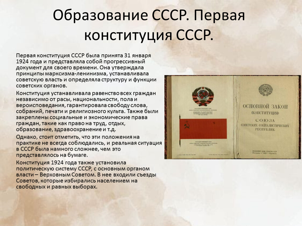 Первая конституция СССР была принята 31 января 1924 года и представляла собой прогрессивный документ для своего времени. Она утверждала принципы марксизма-ленинизма, устанавливала советскую власть и определяла структуру и функции советских органов.
