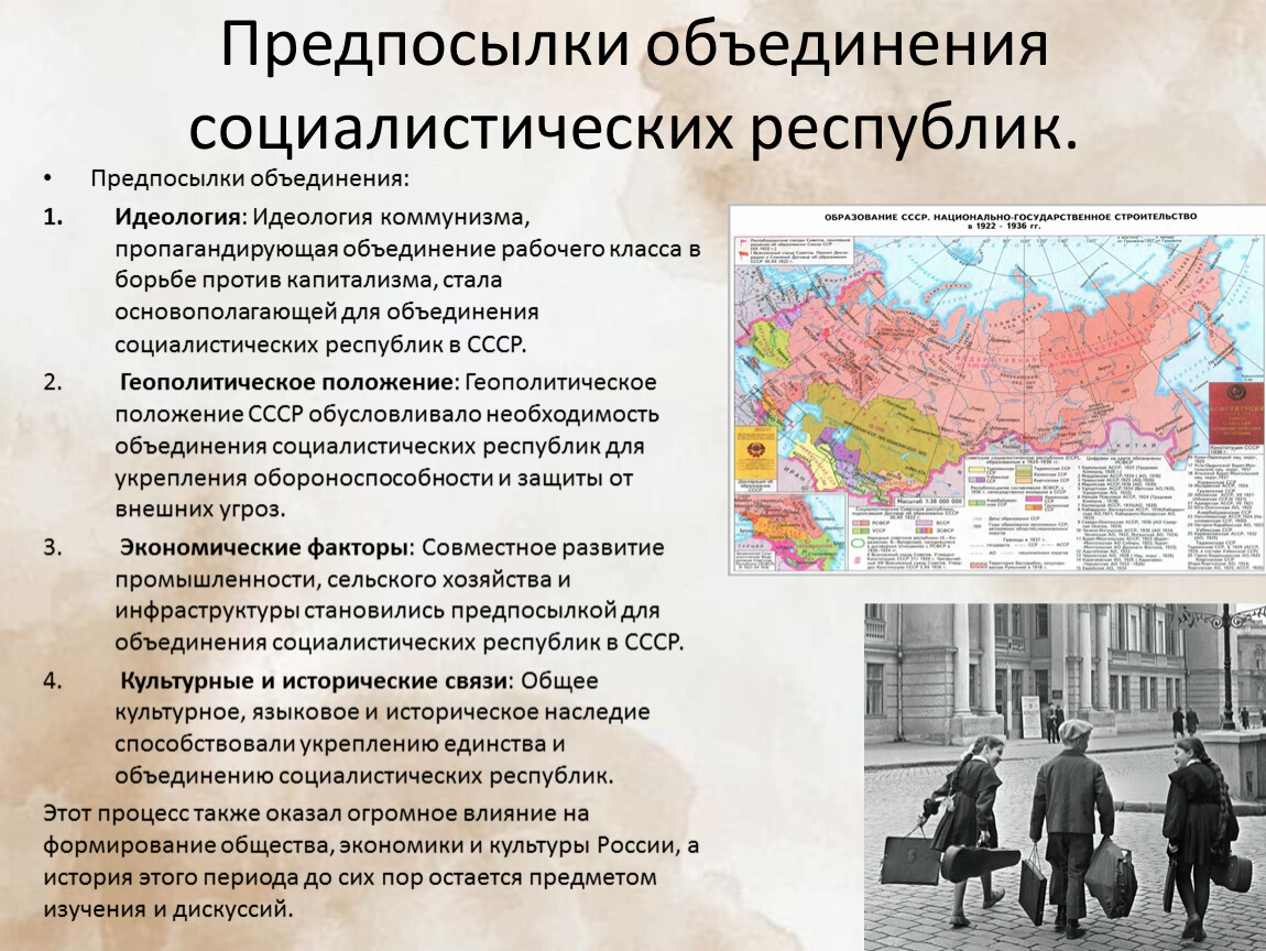 Экономические факторы: Совместное развитие промышленности, сельского хозяйства и инфраструктуры становились предпосылкой для объединения социалистических республик в СССР.