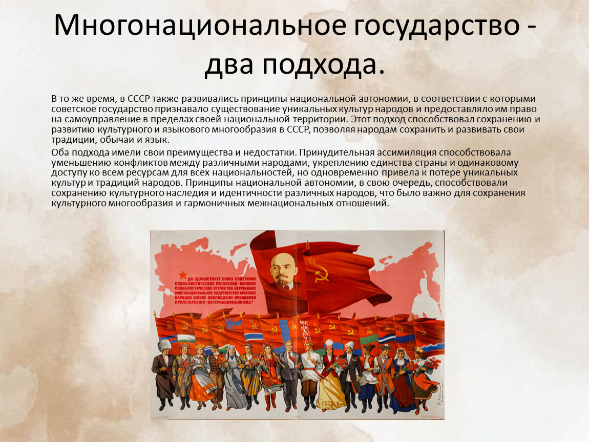 Многонациональное государство - это государство, в котором проживают представители различных национальностей, и которое признает равенство всех наций и национальных меньшинств. В СССР существовали два основных подхода к управлению многонациональным государством - принудительная ассимиляция и принципы национальной автономии.