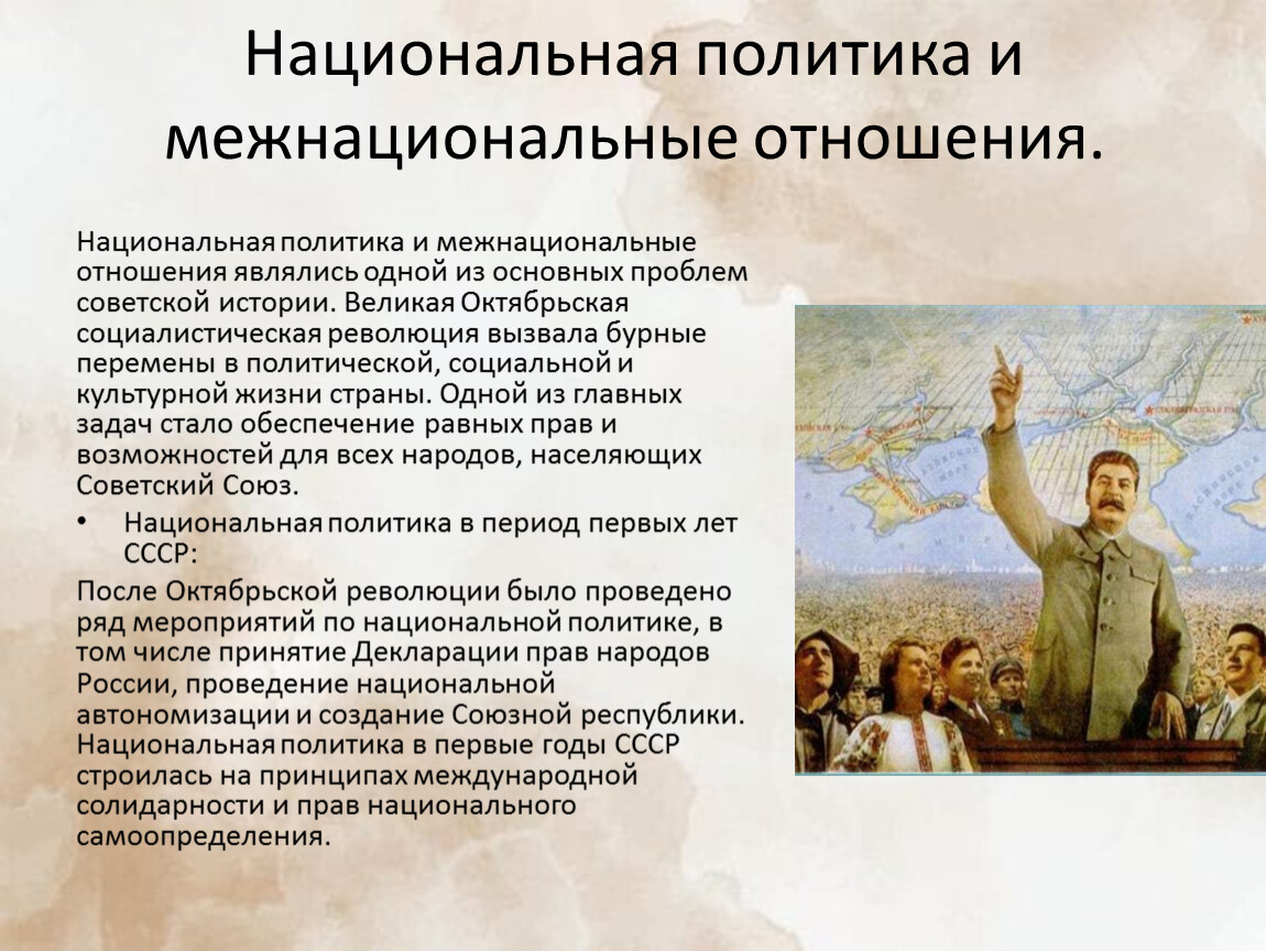 Национальная политика и межнациональные отношения являлись одной из основных проблем советской истории. Великая Октябрьская социалистическая революция вызвала бурные перемены в политической, социальной и культурной жизни страны. Одной из главных задач стало обеспечение равных прав и возможностей для всех народов, населяющих Советский Союз.