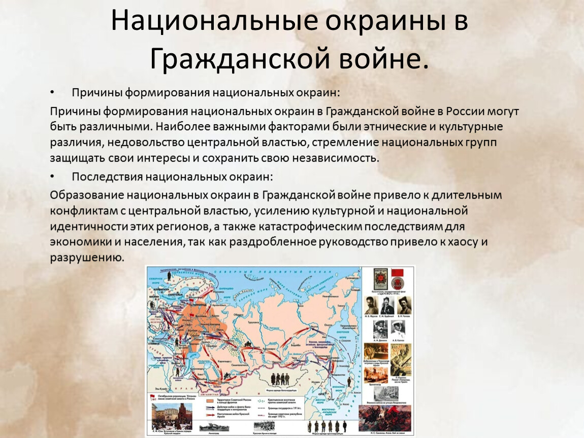 Причины формирования национальных окраин в Гражданской войне в России могут быть различными. Наиболее важными факторами были этнические и культурные различия, недовольство центральной властью, стремление национальных групп защищать свои интересы и сохранить свою независимость.
