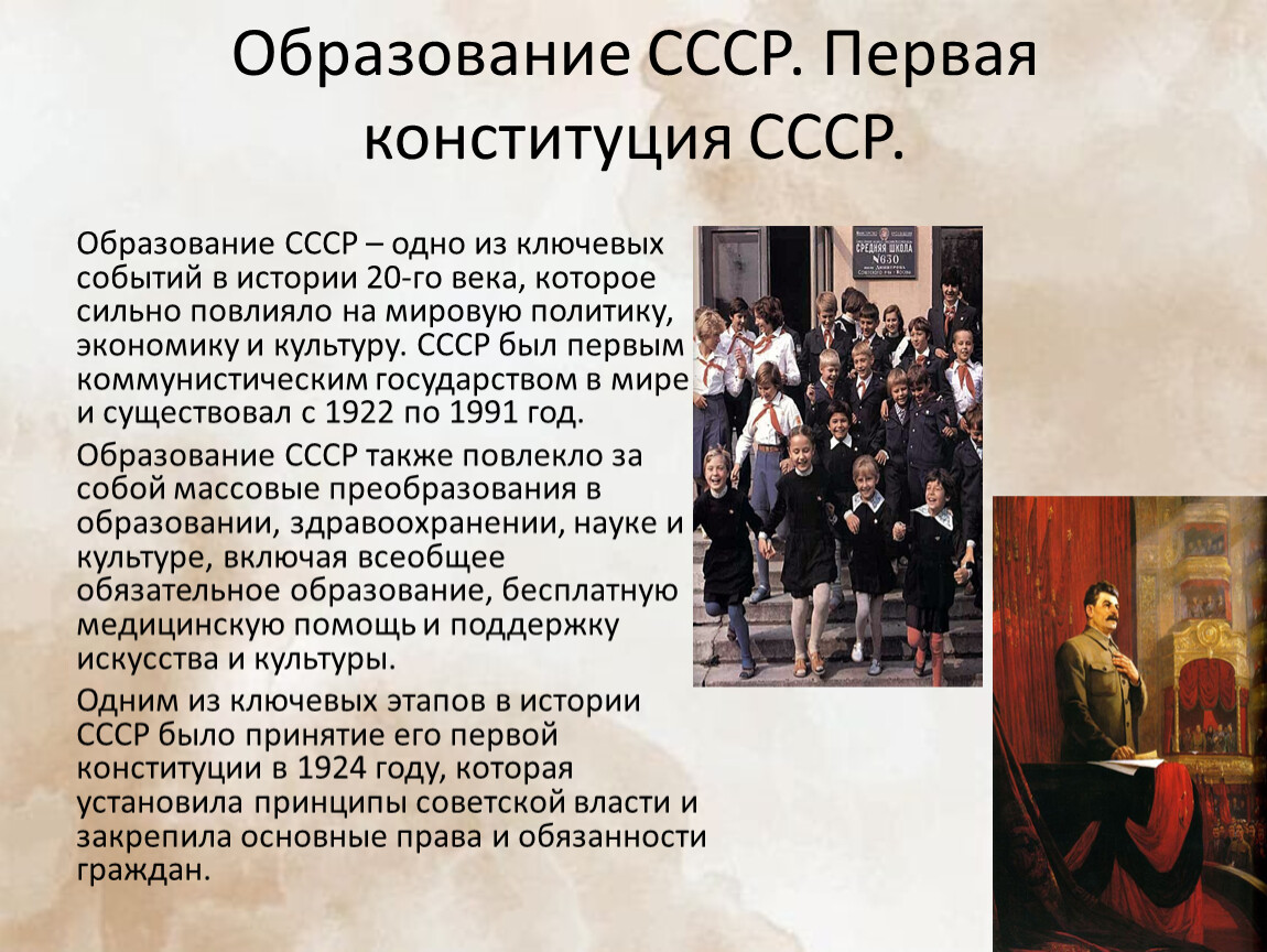 Образование СССР – одно из ключевых событий в истории 20-го века, которое сильно повлияло на мировую политику, экономику и культуру. СССР был первым коммунистическим государством в мире и существовал с 1922 по 1991 год.