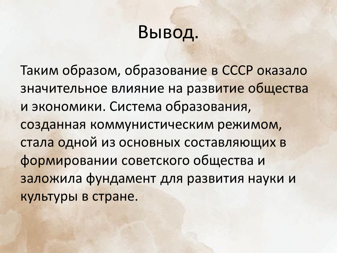 Таким образом, образование в СССР оказало значительное влияние на развитие общества и экономики. Система образования, созданная коммунистическим режимом, стала одной из основных составляющих в формировании советского общества и заложила фундамент для развития науки и культуры в стране.
