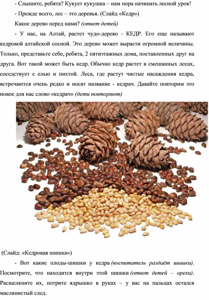 - У нас, на Алтай, растет чудо-дерево - КЕДР. Его еще называют кедровой алтайской сосной. Это дерево может вырасти огромной величины. Только, представьте себе, ребята, 2 пятиэтажных дома, поставленных друг на друга. Вот такой может быть кедр. Обычно кедр растет в смешанных лесах, соседствует с елью и пихтой. Леса, где растут чистые насаждения кедра, встречаются очень редко и носят название - кедрач. Давайте повторим это новое для нас слово «кедрач» (дети повторяют)