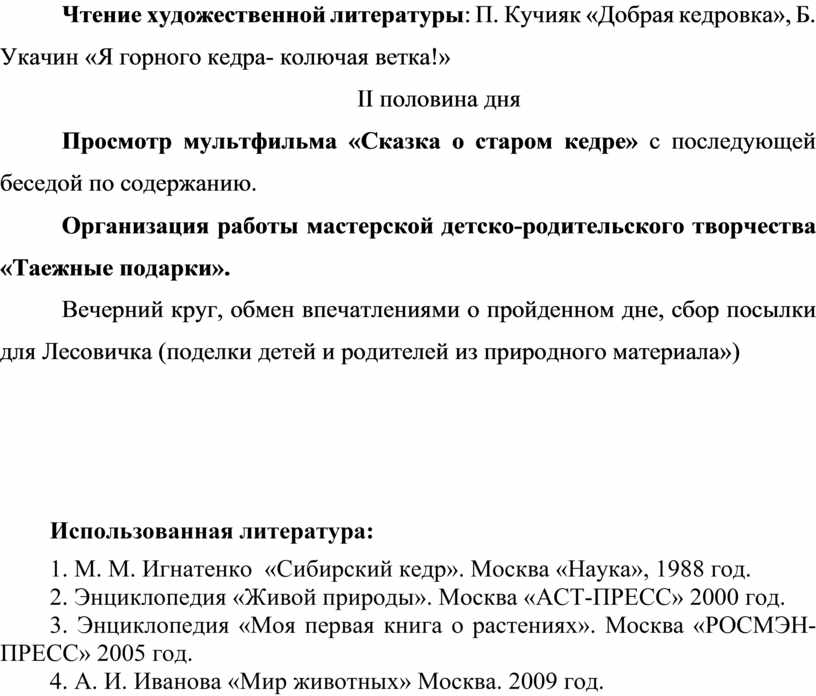 1. М. М. Игнатенко «Сибирский кедр». Москва «Наука», 1988 год.