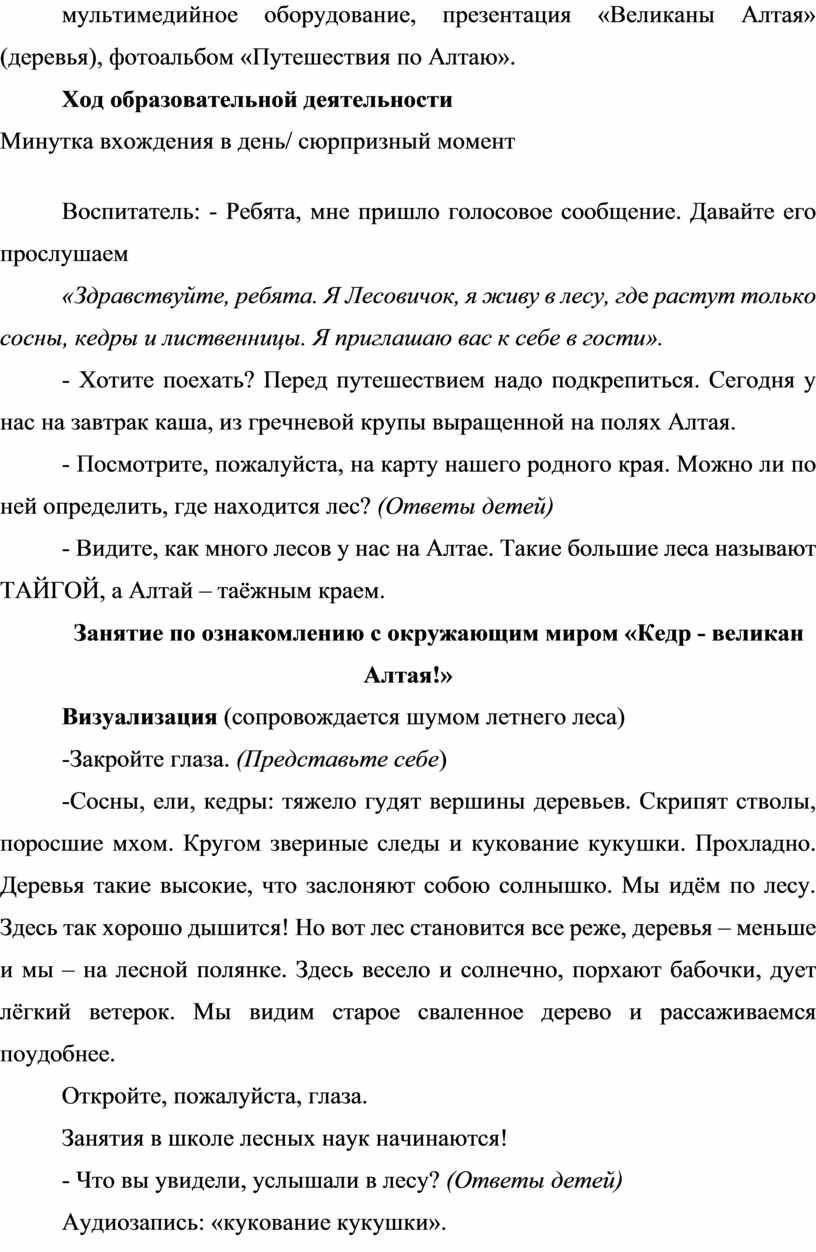 Материал и оборудование: иллюстрации по теме, шишки хвойных деревьев (кедр, сосна, лиственница), мультфильм «Сказка о старом кедре», мультимедийное оборудование, презентация «Великаны Алтая» (деревья), фотоальбом «Путешествия по Алтаю».
