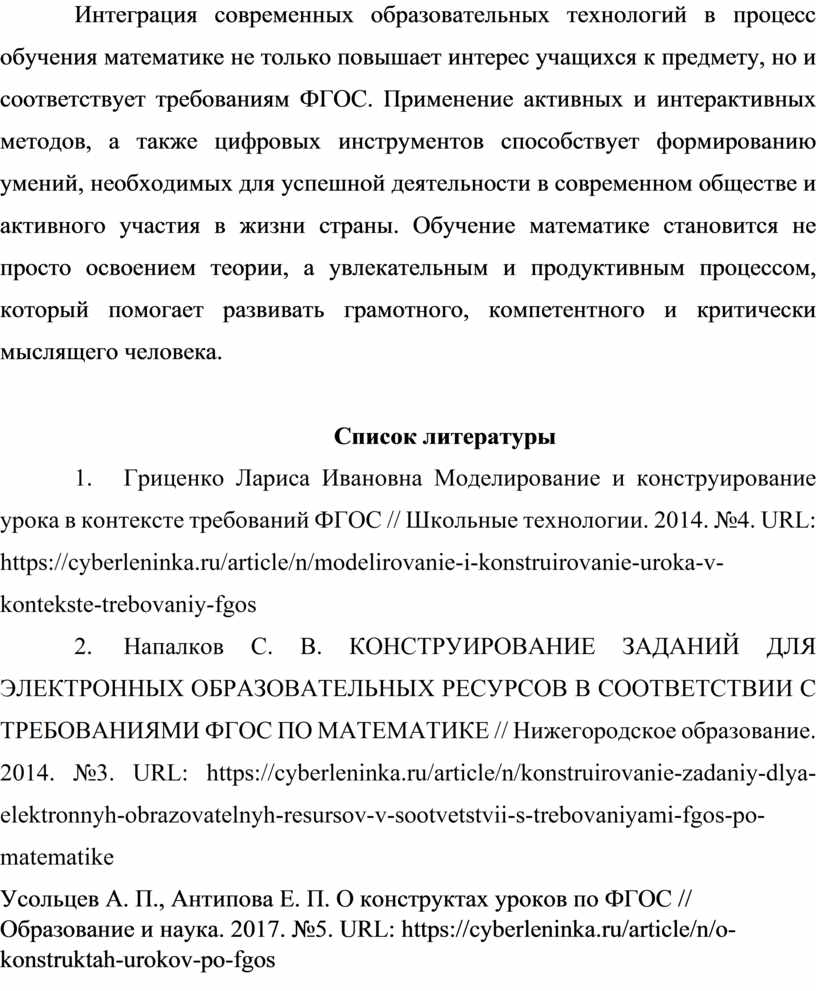 Интеграция современных образовательных технологий в процесс обучения математике не только повышает интерес учащихся к предмету, но и соответствует требованиям ФГОС. Применение активных и интерактивных методов, а также цифровых инструментов способствует формированию умений, необходимых для успешной деятельности в современном обществе и активного участия в жизни страны. Обучение математике становится не просто освоением теории, а увлекательным и продуктивным процессом, который помогает развивать грамотного, компетентного и критически мыслящего человека.