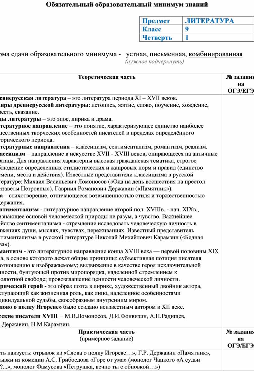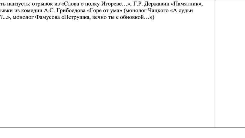Знать наизусть: отрывок из «Слова о полку Игореве…», Г.Р. Державин «Памятник», отрывки из комедии А.С. Грибоедова «Горе от ума» (монолог Чацкого «А судьи кто?...», монолог Фамусова «Петрушка, вечно ты с обновкой…»)