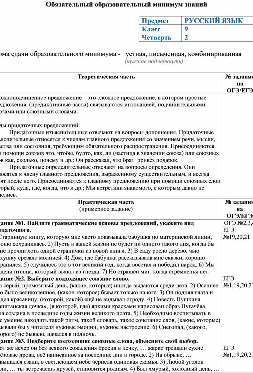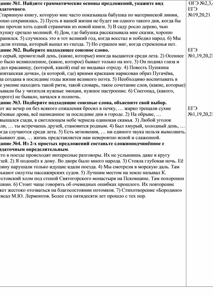 Задание №1. Найдите грамматические основы предложений, укажите вид придаточного. 1) Старинную книгу, которую мне часто показывала бабушка по материнской линии, хорошо сохранилась. 2) Пусть в вашей жизни не будет ни одного такого дня, когда бы вы не прочли хоть одной странички из новой книги. 3) В саду росло дерево, чью верхушку срезало молнией. 4) Дом, где бабушка рассказывала мне сказки, хорошо сохранился. 5) случилось это в тот великий год, когда восстал и победил народ. 6) Мы увидели птенца, который выпал из гнезда. 7) Но страшен миг, когда стремленья нет. Задание №2. Выберите подходящее союзное слово. Был серый, промозглый день, (какие, которые) иногда выдаются среди лета. 2) Осеннее утро было великолепное, (какое, которое) бывает только на юге. 3) Он поднял глаза и увидел красавицу, (которой, какой) ещё не видывал отроду. 4) Повесть Пушкина «Капитанская дочка», (в которой, где) яркими красками нарисован образ Пугачёва, была создана в последние годы жизни великого поэта. 5) Необходимо воспитывать в себе умение находить такой ритм, такой словарь, такое сочетание слов, (какие, которые) вызывали бы у читателя нужные эмоции, нужное настроение. 6) Снегопад, (какого, которого) не бывало, начался в полночь. Задание №3. Подберите подходящие союзные слова, объясните свой выбор. В тот же вечер он без всякого сожаления бросил в печку, … жарко трещали сухие берёзовые дрова, всё написанное за последние дни в городе. 2) На обрыве, … возвышался сзади, в светлеющем небе чернела одинокая скамья. 3) Любой уголок земли, … ты встречаешь друзей, становится родным. 4) Был хмурый, холодный день, … иногда случаются среди лета. 5) Есть мгновения, … ни единого звука нельзя вымолвить. 6) Бывают дни, … жизнь представляется нам невероятно ясной и слаженной. Задание №4. Из 2-х простых предложений составьте сложноподчинённое с придаточным определительным. Часто в поезде происходят интересные разговоры. Их не услышишь даже в кругу друзей. 2) Я подошёл к дому. Во дворе было много народа. 3) Стояла глубокая ночь. Её тишину нарушали только идущие вдали поезда. 4) Мы смотрели в морскую даль. Там мелькают силуэты пассажирских судов. 5) Лучшим местом на земле называл К. Паустовский холм под стеной Святогорского монастыря на Псковщине. Там похоронен Пушкин. 6) Стоит чаще говорить об очевидных ошибках прошлого. Их повторение может жестоко отозваться на благосостоянии потомков. 7) Стихотворение «Бородино» написал М.Ю. Лермонтов. Более ста пятидесяти лет прошло с тех пор.