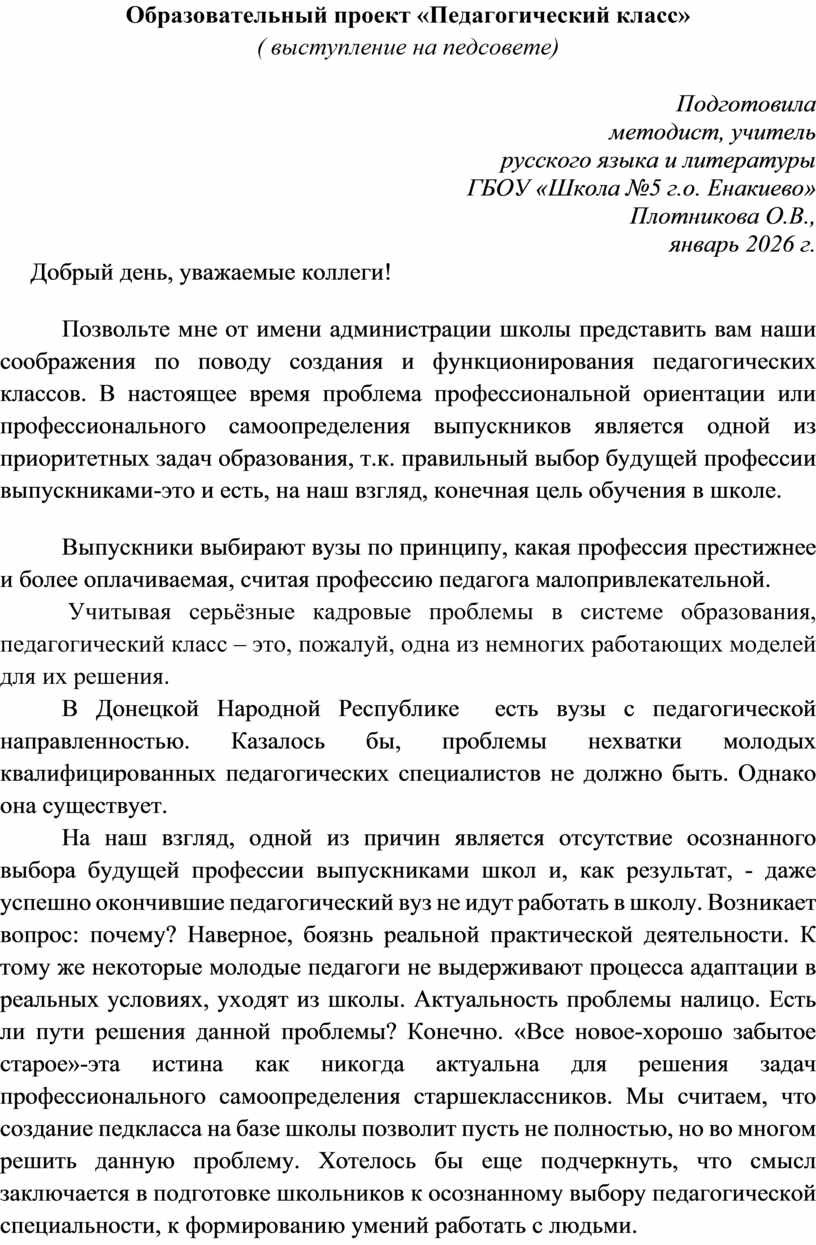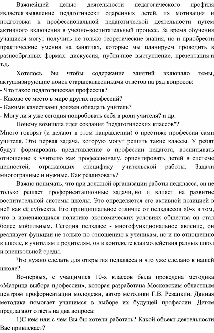 Позвольте мне от имени администрации школы представить вам наши соображения по поводу создания и функционирования педагогических классов. В настоящее время проблема профессиональной ориентации или профессионального самоопределения выпускников является одной из приоритетных задач образования, т.к. правильный выбор будущей профессии выпускниками-это и есть, на наш взгляд, конечная цель обучения в школе.