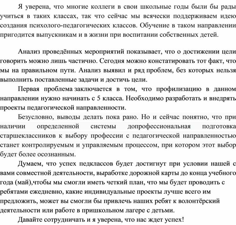 Безусловно, выводы делать пока рано. Но и сейчас понятно, что при наличии определенной системы допрофессиональная подготовка старшеклассников к выбору профессии с педагогической направленностью станет контролируемым и управляемым процессом, при котором этот выбор будет более осознанным.