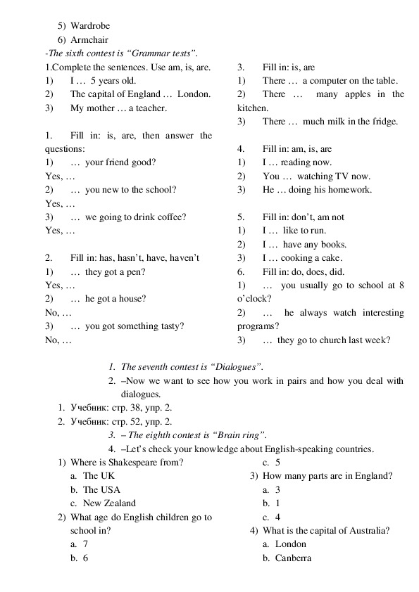 учащихся к мероприятию: повторение грамматики, разучивание песен, приветствия