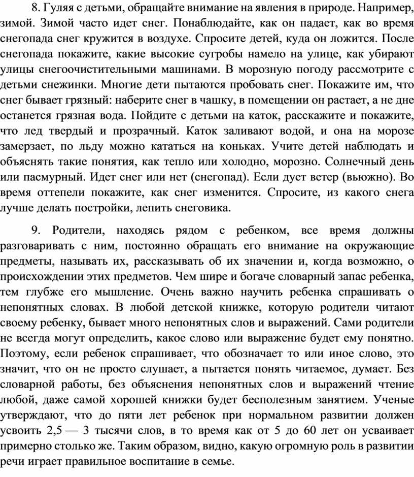 9. Родители, находясь рядом с ребенком, все время должны разговаривать с ним, постоянно обращать его внимание на окружающие предметы, называть их, рассказывать об их значении и, когда возможно, о происхождении этих предметов. Чем шире и богаче словарный запас ребенка, тем глубже его мышление. Очень важно научить ребенка спрашивать о непонятных словах. В любой детской книжке, которую родители читают своему ребенку, бывает много непонятных слов и выражений. Сами родители не всегда могут определить, какое слово или выражение будет ему понятно. Поэтому, если ребенок спрашивает, что обозначает то или иное слово, это значит, что он не просто слушает, а пытается понять читаемое, думает. Без словарной работы, без объяснения непонятных слов и выражений чтение любой, даже самой хорошей книжки будет бесполезным занятием. Ученые утверждают, что до пяти лет ребенок при нормальном развитии должен усвоить 2,5 — 3 тысячи слов, в то время как от 5 до 60 лет он усваивает примерно столько же. Таким образом, видно, какую огромную роль в развитии речи играет правильное воспитание в семье.