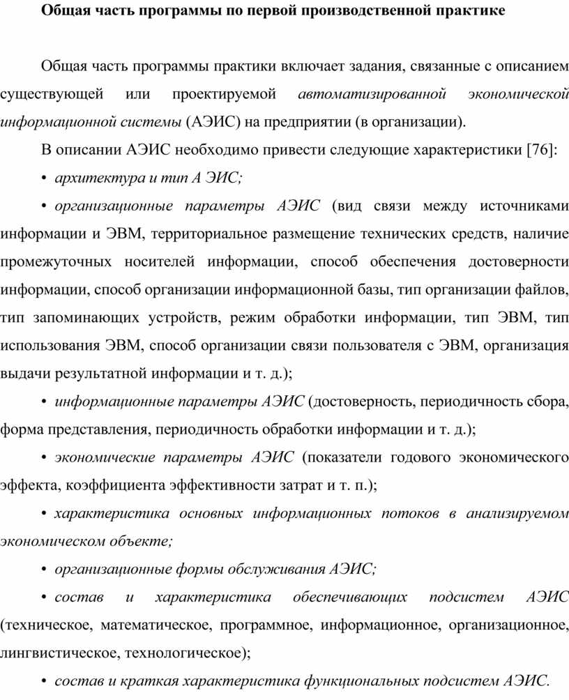 Общая часть программы практики включает задания, связанные с описанием существующей или проектируемой автоматизированной экономической информационной системы (АЭИС) на предприятии (в организации).