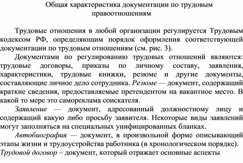 Документами по регулированию трудовых отношений являются: трудовые договоры, приказы по личному составу, заявления, характеристики, трудовые книжки, резюме и другие документы, составляющие личное дело сотрудника. Резюме — документ, содержащий краткие сведения, предоставляемые претендентом на вакантное место. В какой то мере это самореклама соискателя.