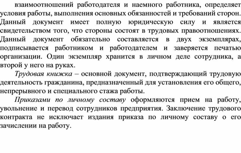 Трудовой договор – документ, который отражает основные аспекты взаимоотношений работодателя и наемного работника, определяет условия работы, выполнения основных обязанностей и требований сторон. Данный документ имеет полную юридическую силу и является свидетельством того, что стороны состоят в трудовых правоотношениях. Данный документ обязательно составляется в двух экземплярах, подписывается работником и работодателем и заверяется печатью организации. Один экземпляр хранится в личном деле сотрудника, а второй у него на руках.