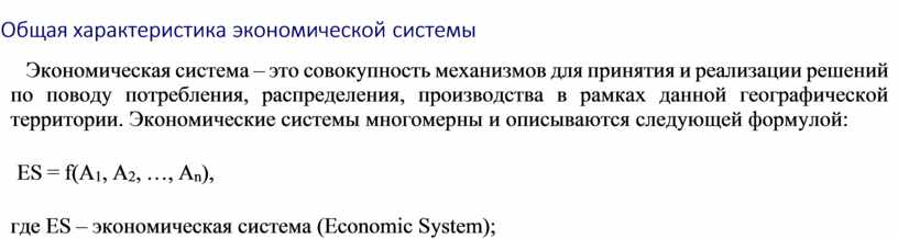 Экономическая система – это совокупность механизмов для принятия и реализации решений по поводу потребления, распределения, производства в рамках данной географической территории. Экономические системы многомерны и описываются следующей формулой: