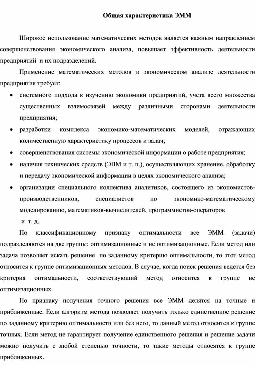 По классификационному признаку оптимальности все ЭММ (задачи) подразделяются на две группы: оптимизационные и не оптимизационные. Если метод или задача позволяет искать решение по заданному критерию оптимальности, то этот метод относится к группе оптимизационных методов. В случае, когда поиск решения ведется без критерия оптимальности, соответствующий метод относится к группе не оптимизационных.